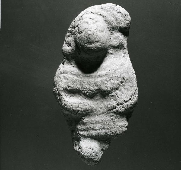 Figurina fittile femminile. Il viso è quasi totalmente eroso. Il naso è lungo ed importante. La figurina è rappresentata stante con le mani posate sul ventre. Porta un copricapo semilunato costituito da tre cordoni. Porta inoltre orecchini ad anello, una collana a più fili di cui l¿ultimo filo presenta pendenti. La figurina veste una gonna a balze orizzontali ed un quemitl (corpetto) e forse un mantello. La figurina presenta il verso piano. Impasto: 2.5 YR REDDISH GRAY 5/1 Ingobbio: 5 YR REDDISH YELLOW 7/6 Cottura: Ossidante.