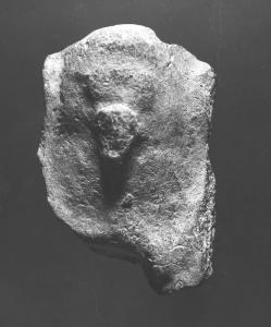 Testina di figurina fittile. Il frammento ha subito una fortissima erosione ed è quasi illeggibile. Del viso sono ben visibili la linea del mento ed i contorni del viso stesso, dritto e prominente. Della bocca sono visibili le labbra inferiori. E¿ presente un copricapo o un¿acconciatura "a pilastro". Impasto: 5 YR LIGHT REDDISH BROWN 6/4. Cottura ossidante.