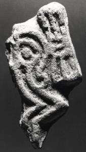 Frammento di pintadera in terracotta con motivi curvilinei. Il soggetto è di tipo zoomorfo. E' visibile un occhio sormontato da un ornamento in cotone lagato da un nodo centrale.