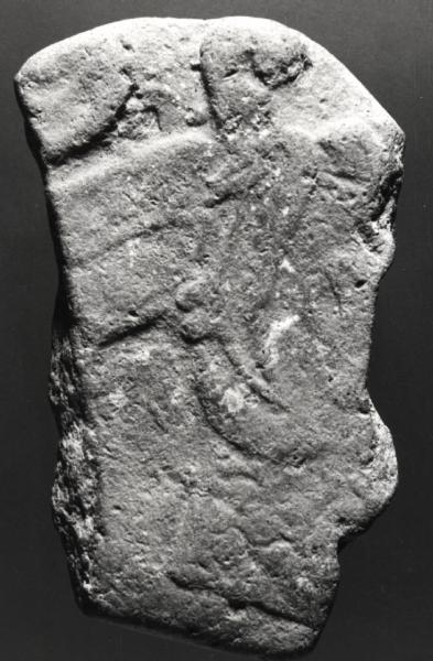 Frammento di placca fittile. L'iconografia del frammento risulta illeggibile. Impasto medio di colore ocra chiaro - mattone chiaro (x 9 - 10, y 12 - 13). Ingobbio evanescente. Cottura ossidante.