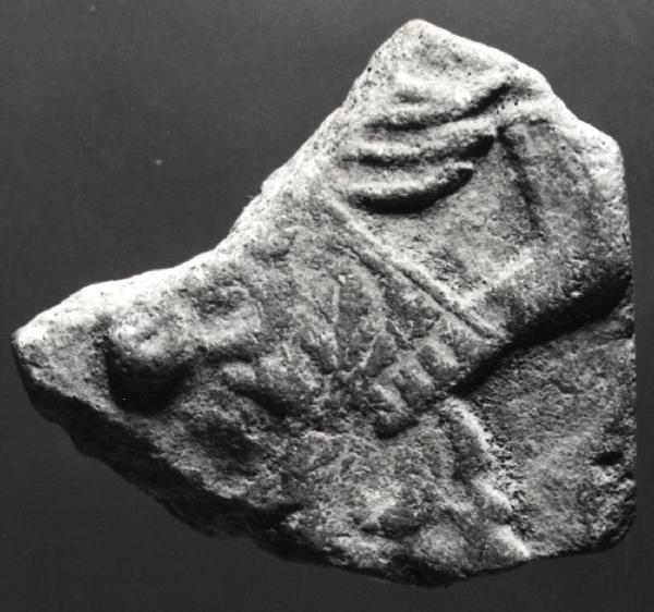 Frammento placca fittile. L'iconografia del frammento appare illeggibile. Impasto medio di colore ocra chiaro - mattone chiaro (x 9 - 10, y 12 - 13). Ingobbio evanescente. Cottura ossidante.