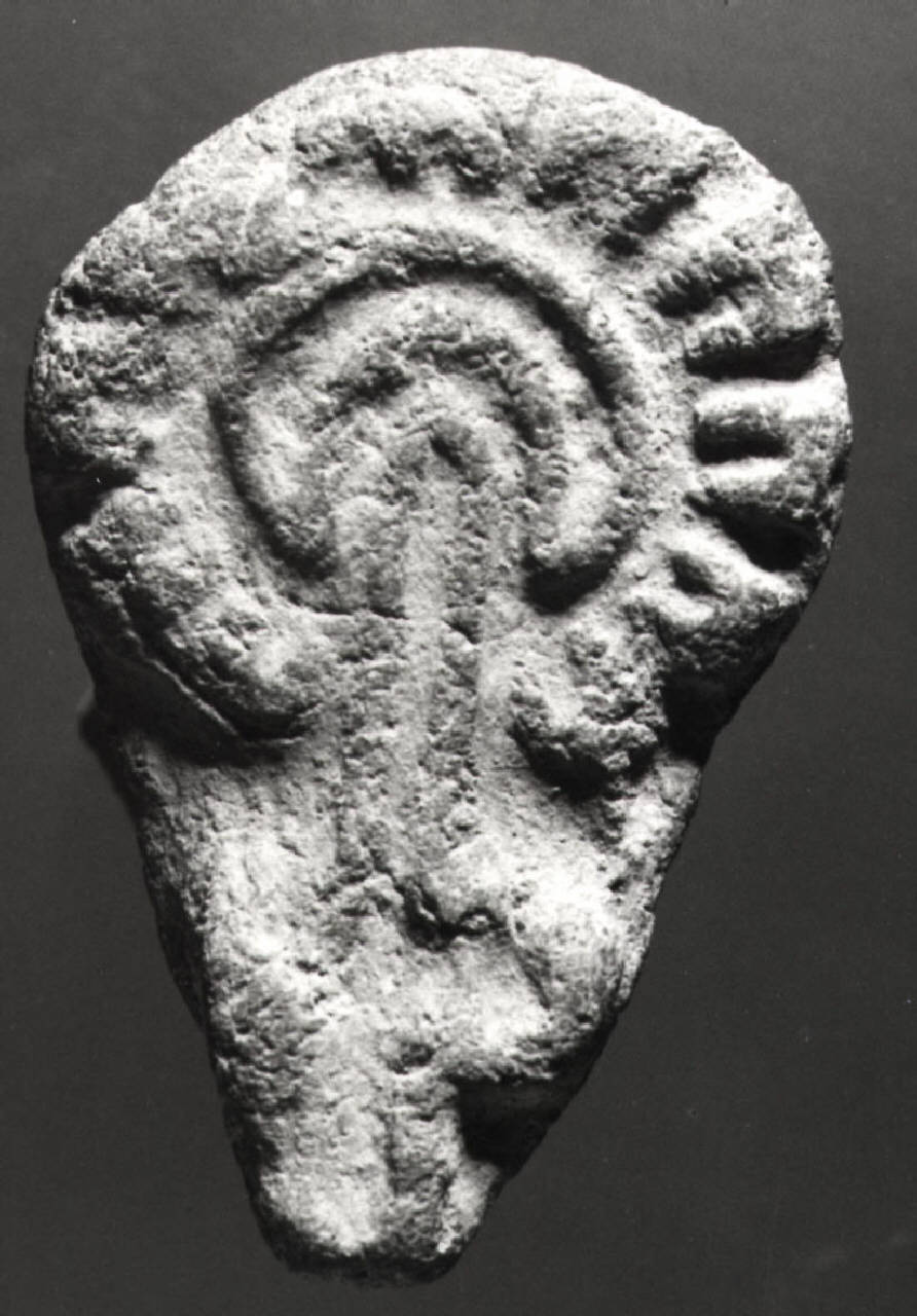 Pintadera in terracotta a forma triangolo-circolare, con impugnatura pizzicata. E' possibile che il frammento rappresenti parte di un propulsore per dardi (atlatl), in particolare l'ornamento circolare in piume o batuffoli di cotone posto al di sopra dell'impugnatura, anch'essa visibile nella forma di due anelli dove venivano infilate le dita.