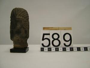 Figurina fittile antropomorfa raffigurante un individuo stante con orecchini e copricapo piumato. Si tratta di un tentativo di imitazione di una figurina di ambito tolteco.