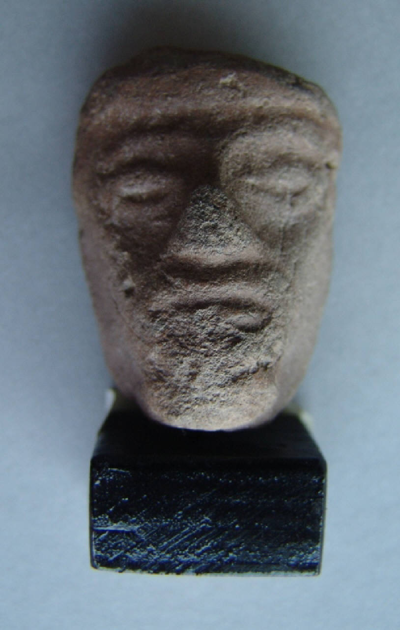 Testina di figurina fittile antropomorfa con volto subquadrangolare e tratti molto marcati. Glo occhi sono ellittici, il naso ampio e la bocca sporgente. Una fascia orizzontale passa sulla fronte dell'uomo.