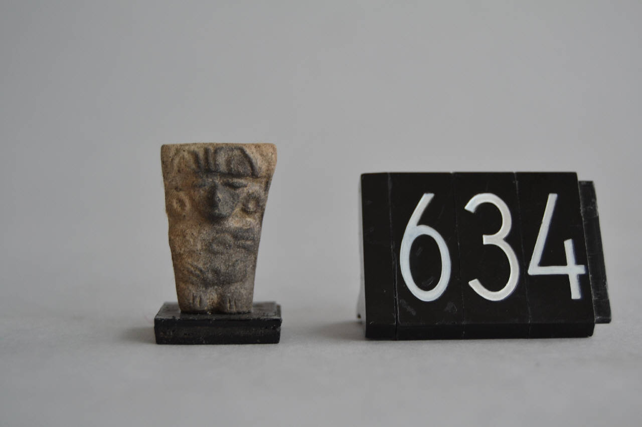 Figurina fittile antropomorfa che raffigura un individuo stante con grande coèpricapo e orecchini. L'uomo pare sostenere uno specchio ventrale.