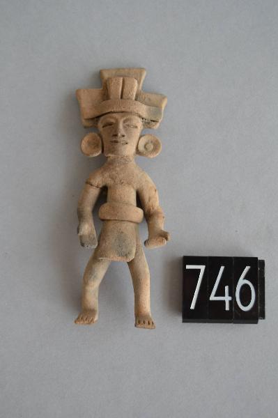 Figurina fittile antropomorfa. Il viso è di forma ovale allungata. Gli occhi sono indicati da due incisioni, presentano palpebre in rilievo e sopracciglia ben disegnate le quali s'incontrano alla radice del naso. Il naso è dritto e lungo. La bocca è ben disegnata dalle labbra sottili e in rilievo; è semiaperta. La figurina presenta corpo schematico, con busto, braccia e gambe rese mediante dei rotoli di terracotta; braccia gambe sono degli appliquè. La figurina si presenta in piedi, stante e con le ginocchia leggermente piegate e gambe divaricate con un piede davanti più avanti dell'altro. Le braccia sono piegate con i palmi verso l'alto e la mano destra è modellata come se sorreggesse qualcosa. Presenta le dita dei piedi disegnate tramite delle incisioni. La figurina presenta dei grandi orecchini ad anello con ornamento centrale rotondo in rilievo. Gli orecchini sono degli appliquè. Il copricapo è formato da tre diversi elementi dell'appliquè che vennero assemblati fra loro. Il primo elemento forma la base del copricapo ed è una fascia orizzontale liscia, dalla quale emerge un elemento costituito da due bande verticali, che si appoggiano sulla parte posteriore del copricapo, a forma di T invertita. Il perizoma a grembiule è sostenuto da un grande cinturone a fascia. La posizione