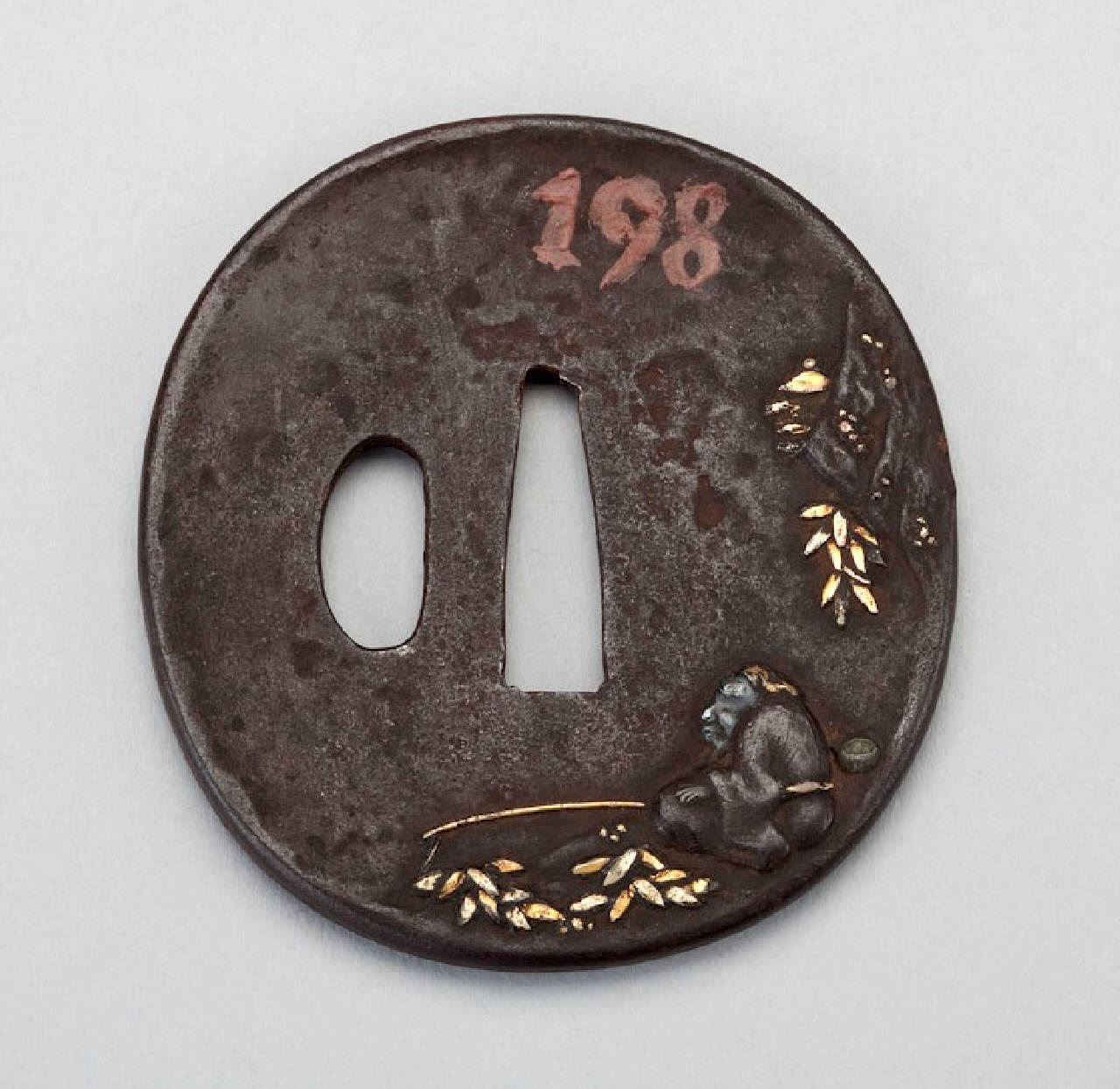Elsa (tsuba) in ferro con superficie martellata (tsuchimeji), lavorazione ad alto rilievo (takabori) con ageminatura in oro (iroezogan). Scena di vecchio pescatore seduto con albero. Sul retro pagoda.