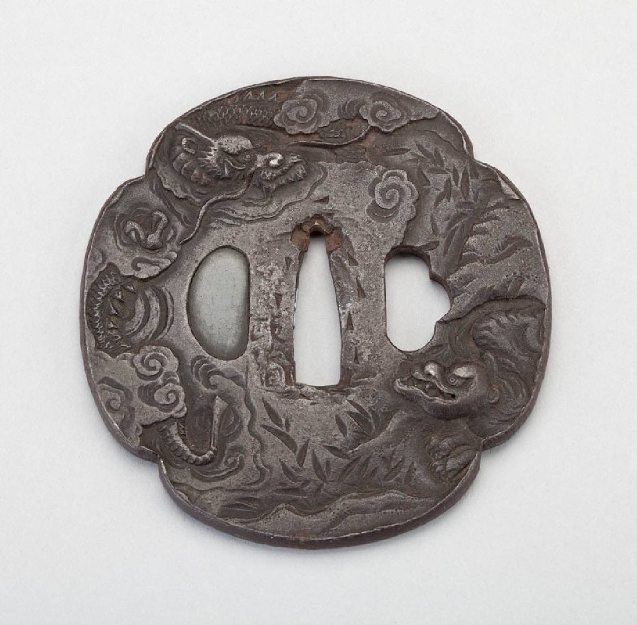 Elsa (tsuba) in ferro di forma quadrilobata. Superficie leggermente granulosa (ishimeji), lavorazione ad alto rilievo (takabori), rilievo sommerso (shishiabori) e incisione simile a tratti di pennello (katakiribori). Scena con tigre (tora) e bambù (take), e drago (ryu) e nuvole (kumo). Foro del coltellino (kogatana) ostruito da piastrina in lega metallica (shakudo).