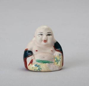 Figura di Hotei in bisquit smaltato in blu, giallo, rosso e verde.