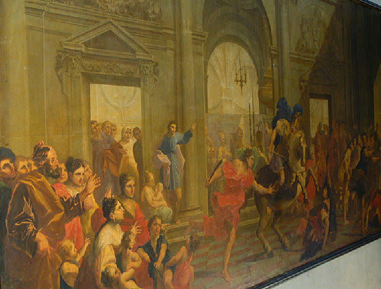 Al centro Eliodoro, di schiena, che cade sopraffatto dai messi divini: un guerriero a cavallo e un altra figura con la verga. Ai lati due gruppi con gli orfani e le vedove e altre figure, in piedi e sedute. Sullo sfondo, la facciata del tempio, a tre portali: in quello centrale appare la figura del sacerdote.