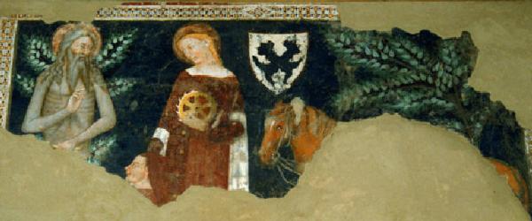 Santa Caterina, in piedi, frontale, con il viso volto verso sinistra, tiene la ruota nella mano sinistra e presenta un giovane cavaliere inginocchiato, di profilo, verso sinistra, a San Onofrio; il santo eremita, sulla sinistra, frontale, con il viso volto a destra, benedice con la mano destra sollevata; al centro, stemma della famiglia Merlini; a destra, resti del cavallo e arbusto. Sul lato superiore e sui due laterali, resti di fregio alla cosmatesca.