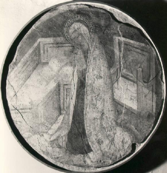 La Madonna è inginocchiata in atteggiamento di preghiera, con il capo reclinato, le mani giunte, un ampio mantello sulle spalle; attorno a lei delimitano l'ambiente due cassapanche: su quella di sinistra, angolare, è aperto un libro di preghiere.