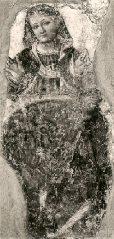 La figura frontale della Madonna, frammentaria,è in atteggiamento di preghiera, con le mani aperte ed il capo velato leggermente reclinato; in alto a destra si intuisce la veste di un'altra figura (un angelo?).