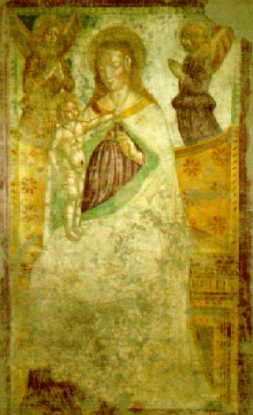 La Madonna siede pressoché frontale su un trono dallo schienale decorato e regge sulle ginocchia Gesù Cristo Bambino che, in piedi, volto verso destra, si aggrappa con una mano allo scollo della veste della Madre; è nudo e reca al collo il corallo. In secondo piano, dietro il trono, due angeli con le mani giunte in atteggiamento orante. Bande decorative incorniciano la scena.