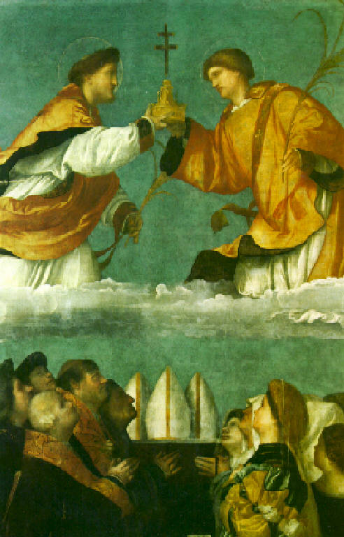 Nell'angolo di sinistra in basso cinque figure maschili a mezzo busto, fra cui tre vescovi, e nell'angolo destro in basso gruppo di figure femminili a mezzo busto fra cui una nobildonna : tutti col capo volto verso l'alto e in atto di adorazione. Fra i due gruppi, su un ripiano, tre mitrie. In alto, su una nuvola, spiccano nel cielo San Faustino e San Giovita con aureola e in ginocchio uno di fronte all'altro, che tengono nella sinistra la foglia di palma e con la destra innalzano la reliquia della Santa Croce fra i due volti ad essa rivolti.