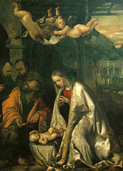 In prima piano la Madonna inginocchiata adora Gesù Cristo Bambino, adagiato per terra sul manto; sulla sinistra, in secondo piano, San Giuseppe seduto volge la testa verso due pastori posti in piedi alle sue spalle; all'estrema sinistra bue accovacciato e testa di asino; in alto, al centro, tre angioletti svolazzanti reggono un cartiglio con note musicali. La scena si svolge davanti ad un'architettura diroccata classicheggiante, che a destra lascia vedere un paesaggio agreste con altre architetture.