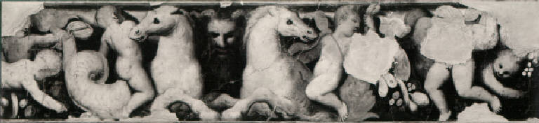 Al centro due cavalli marini affrontati, cavalcati ognuno da un putto, volgono indietro il muso. Dietro, in secondo piano, mascherone con corna caprine. Ai lati putti variamente atteggiati giocano tra fiori e frutti.\n.