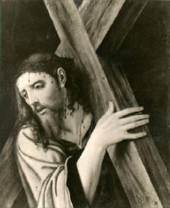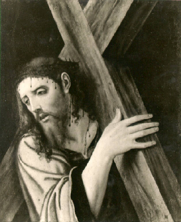 Gesù Cristo a mezzo busto con corona di spine e volto sofferente porta sulla spalla sinistra la pesante croce di legno. Il fondo è scuro.