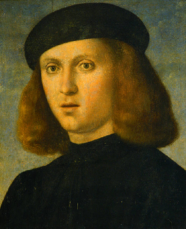 Uomo giovane a mezzo busto e di tre quarti, con veste e copricapo (tocco) nero, ha il viso incorniciato da folta capigliatura. Sullo sfondo cielo e nuvole.