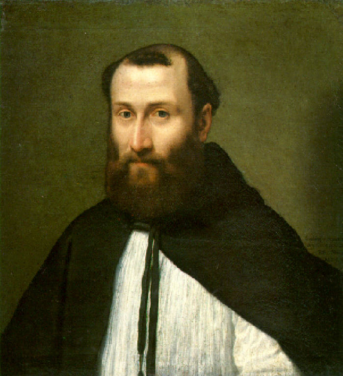 A mezzo busto e di tre quarti è un canonico lateranense, con barba, mantello nero e saio bianco, che volge lo sguardo allo spettatore.