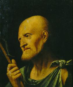 San Girolamo a mezzo busto di tre quarti verso sinistra guarda il crocefisso che tiene con la destra.