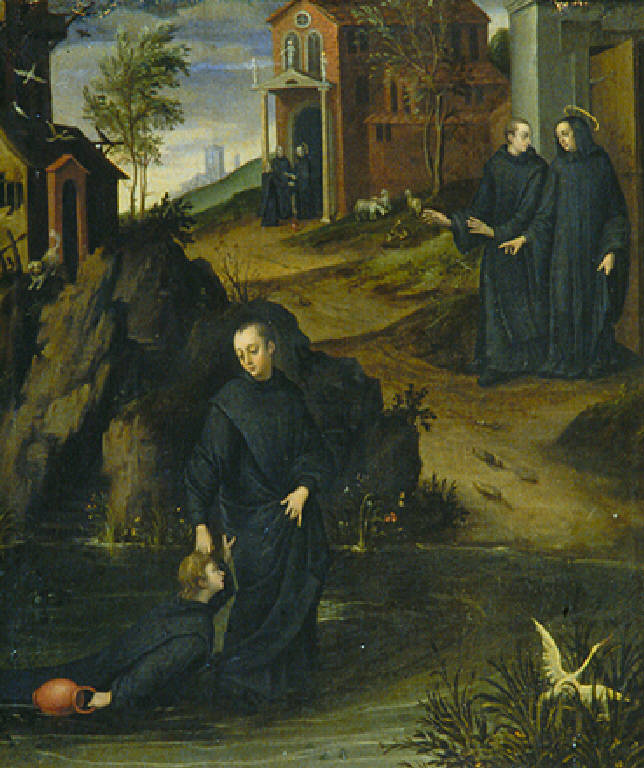 In primo piano, dentro un laghetto, San Mauro solleva dall'acqua, prendendolo per i capelli, San Placido che reca in mano una brocca. Nell'angolo destro, in un cespuglio, uccelli acquatici. In secondo piano, sulla riva, presso la porta di un convento, due frati. In terzo piano, presso una chiesa, tre monaci. Sulla sinistra, su un roccione, architettura, cane, uccelli e alberi.