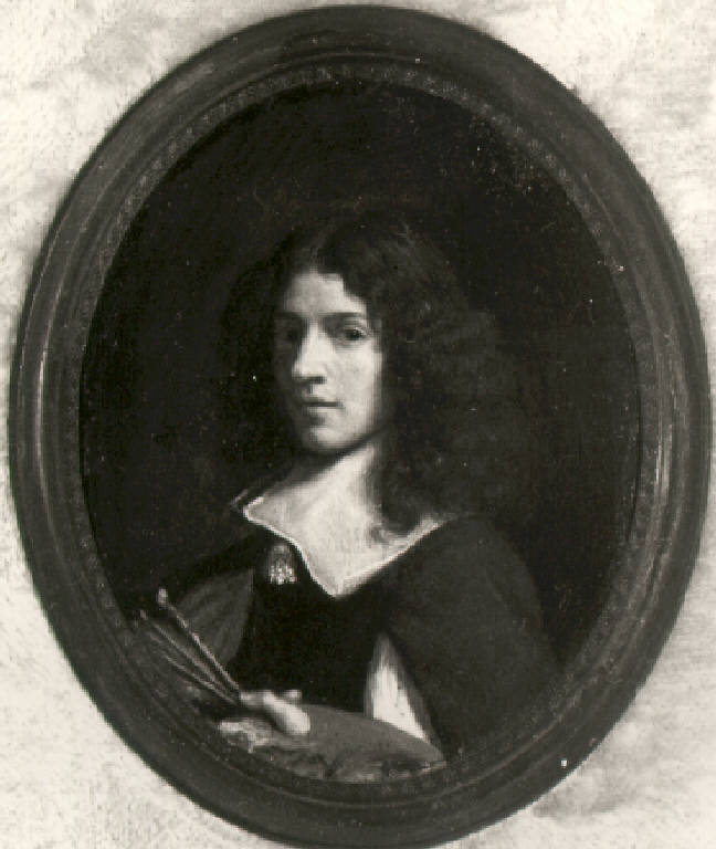 Il personaggio è volto di tre quarti e a mezzo busto, il viso, dal lungo naso appuntito, è incorniciato da lunghi capelli; in primo piano , trattenuta da una mano, tavolozza e pennello.