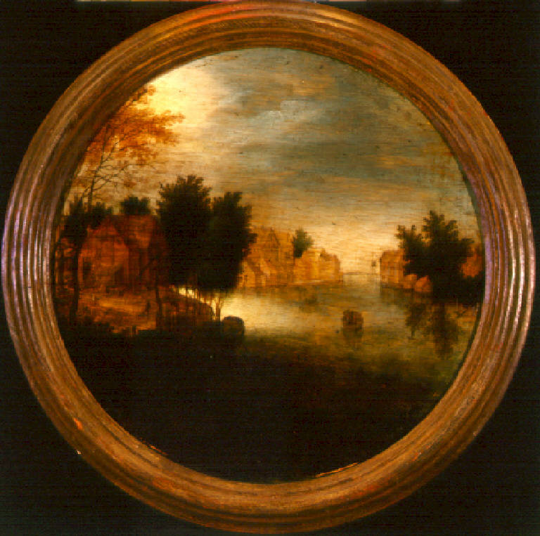 Sulle rive di un fiume si affacciano diverse case, inframmezzate da alcuni alberi; sulle sponde si notano poche figure e sull'acqua sono delle barche.