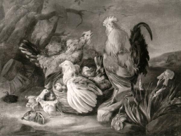 A destra un gallo, in primo piano una pianta di iris; al centro, una chioccia con una covata di pulcini in un cesto, dietro al quale è un altro gallo.