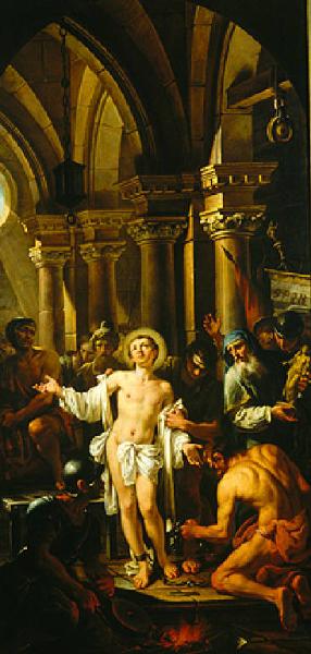 La scena si svolge in un interno, di cui si vedono sulla destra una fuga di colonne che sostengono ogive; al centro in primo piano è il santo adolescente che apre le braccia, mentre alcuni sgherri gli tolgono le vesti e le catene. In primissimo piano un soldato di profilo aziona un mantice per attizzare il fuoco del martirio. Ai lati e alle spalle del protagonista, un folto gruppo di figure assiste alla scena.