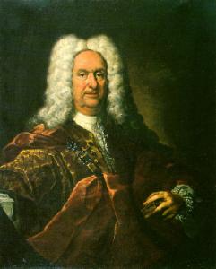 Il personaggio è ritratto frontalmente e a mezzo busto; indossa una lunga parrucca, sulla spalla della giacca si vede una bandoliera con fibbia preziosa che trattiene un ampio panneggio; nella mano destra l'uomo stringe una tabacchiera.