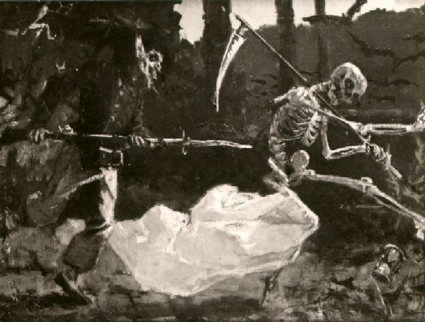 Un bersagliere, con sembianze animalesche, scaccia, con la baionetta innestata sul fucile, lo scheletro della Morte, che impugna la falce e lascia cadere sudario e clessidra.