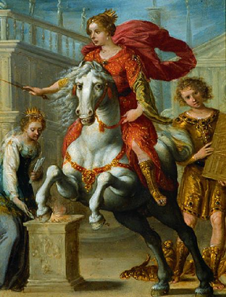 Al centro, in groppa ad un cavallo impennato, figura di giovane donna con corona e calzari, di tre quarti verso sinistra, con uno scettro nella mano destra; a sinistra figura femminile con corona alimenta il fuoco acceso sopra l'ara quadrangolare posta di fronte; a destra figura frontale di giovinetto con tunica decorata e calzari che regge tra le mani il modellino dell'edificio di fondo; a terra, ai suoi piedi, serie di piccole figure. Nello sfondo, a sinistra edificio con balconata e statue, colonna, e a destra edificio con timpano.