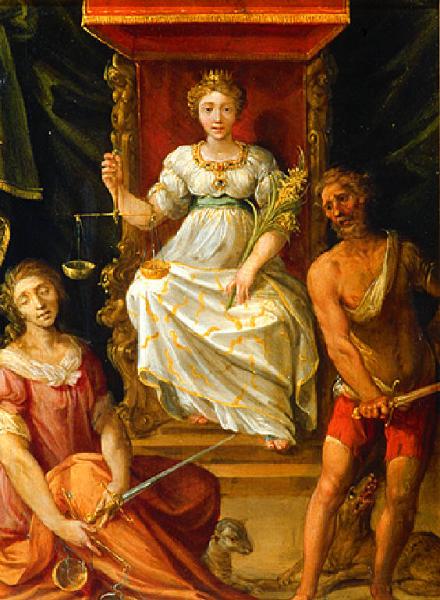 Al centro, una figura femminile frontale con corona siede su un trono a baldacchino con piccole statue intagliate e regge una bilancia e un fascio di fiori; a sinistra, una figura femminile con gli occhi chiusi è seduta a terra volta di tre quarti verso destra e tiene nelle mani una spada e una bilancia; ai suoi piedi, un agnello; a destra, figura maschile in piedi che impugna una spada tenendo il braccio sinistro appoggiato al fianco; dietro, ai suoi piedi, animale. Nello sfondo, tessuto drappeggiato.