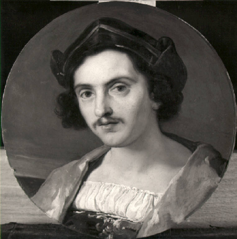 Giovane uomo, a mezzo busto, con corta barba; indossa un cappello ed una camicia arricciata, sulle spalle un mantello in velluto.