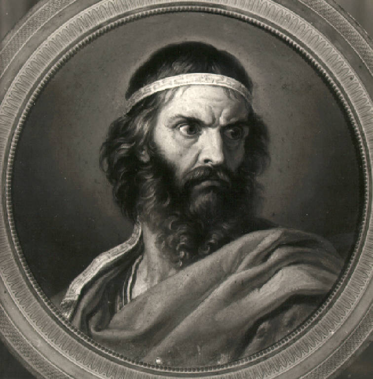 Un uomo, a mezzo busto e volto di tre quarti verso destra, indossa un mantello e porta barba e capelli lunghi trattenuti da una fascia decorata a meandro.