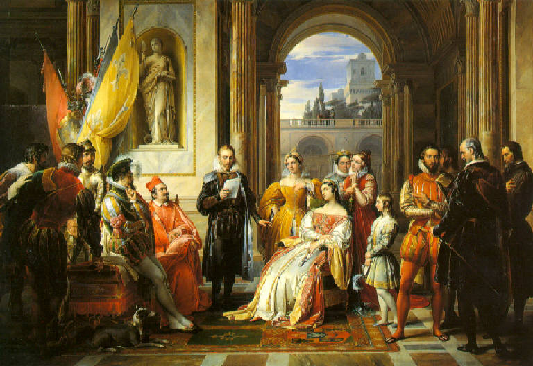 Al centro Torquato Tasso legge rivolto verso Eleonora d'Este, a sinistra il duca Alfonso, a destra il Guarini, il Pigna, il Montecatini e Ascanio Giraldini, attorno cortigiani.
