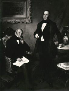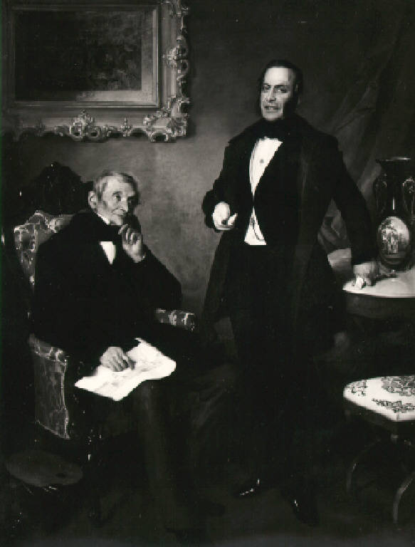All'interno di un salotto due uomini: a destra Luigi Basiletti seduto su una poltrona tiene sulle ginocchia un disegno, a sinistra Paolo Richiedei in piedi appoggiato ad un tavolo sul quale è posato un vaso; sullo sfondo, appeso alla parete si intravede un dipinto.