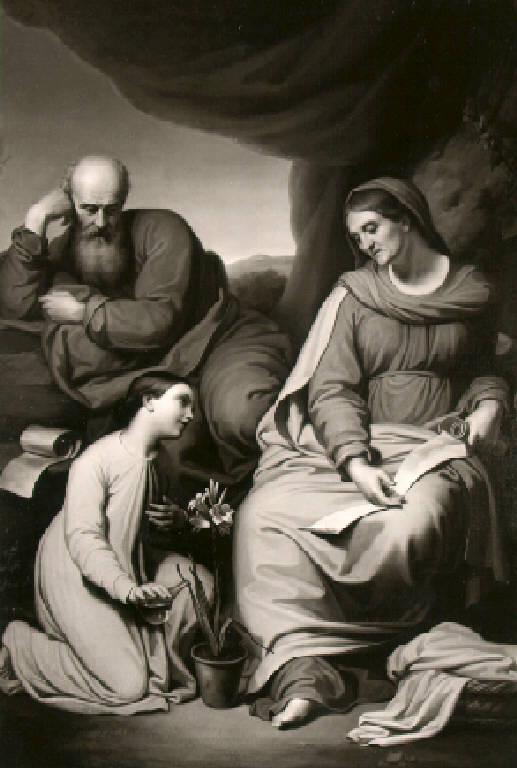 San Gioacchino e Sant'Anna seduti guardano la Madonna con ampolla inginocchiata davanti ad una vaso con pianta di giglio, sullo sfondo paesaggio.