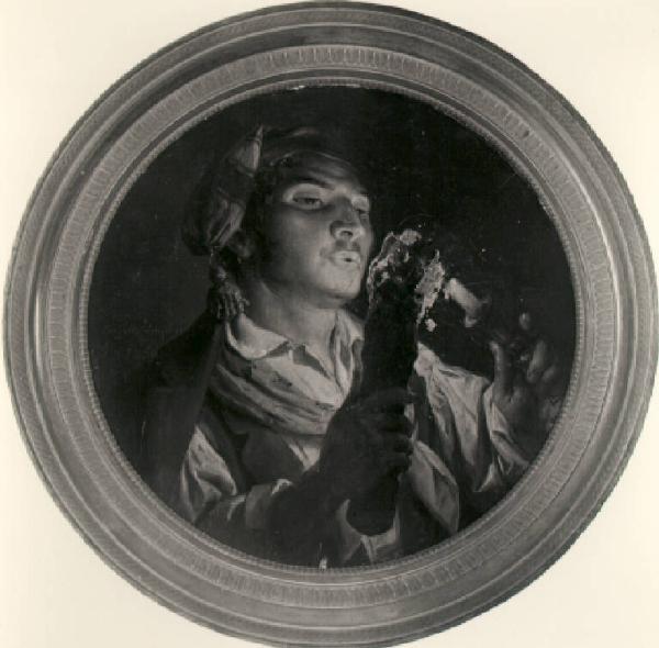 Al centro del tondo un uomo, a mezzo busto, in abiti contadini e con un cappello con nappa, tiene nella mano sinistra una bugia e nella mano destra un tizzone sul quale sta soffiando.