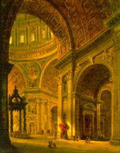 Veduta dell'interno della basilica di San Pietro a Roma; sullo sfondo il baldacchino del Bernini, la statua bronzea di San Pietro in cattedra, e l'imposta della cupola.