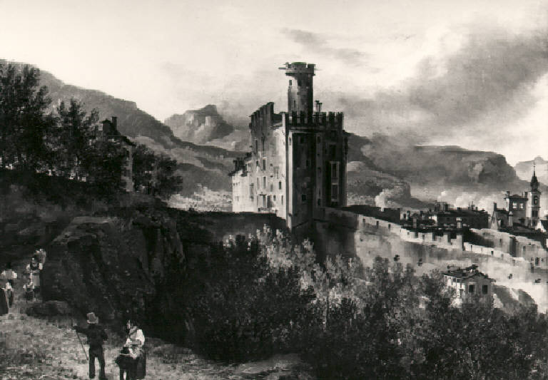 Veduta del castello di Trento e di parti delle mura al di fuori di queste, in primo piano delle figure di popolani; sullo sfondo paesaggio con montagne.