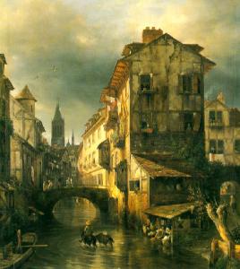 Veduta di un canale sul quale si affacciano alcune case, in primo piano a sinistra alcune donne al lavatoio, al centro del canale un uomo a cavallo, paesaggio sullo sfondo.