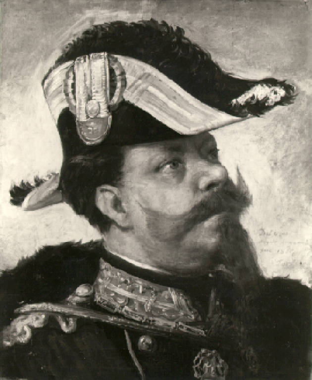Ritratto di Vittorio Emanuele II a mezzo busto rivolto verso destra, indossa uniforme e feluca con mantello di pelliccia, porta lunghi baffi e barba a pizzo.