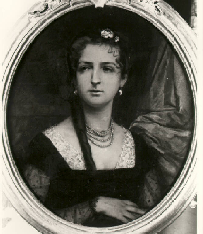 La donna è presentata a mezzo busto e volta di tre quarti; i capelli sono raccolti e un lungo boccolo scende sulla spalla; a destra, un drappo.