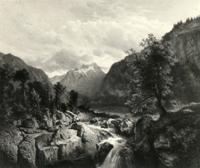 Fra le montagne un fiume forma una cascata; sullo sfondo alta montagna innevata.