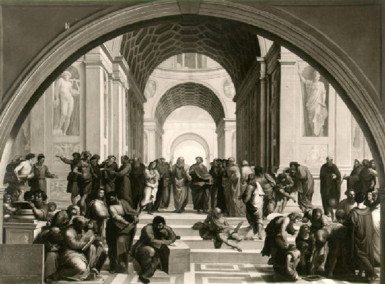 Platone ed Aristotele avanzano al centro del dipinto affiancati da due ali di discepoli in vari atteggiamenti; davanti a loro, su scalini altri uomini in pose varie, alle loro spalle si susseguono tre soffitti con volta ad arco e cassettoni.