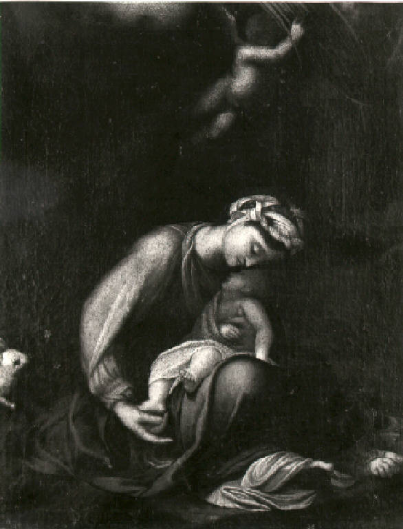 La Madonna seduta in terra si china su Gesù Bambino che tiene in grembo. In alto al centro vola un piccolo angelo; in basso a sinistra piccolo coniglio.