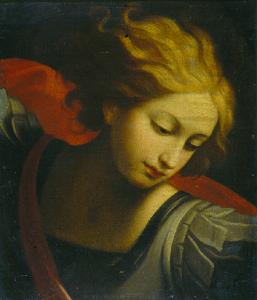 Angelo a mezzo busto leggermente di tre quarti con i capelli mossi dal vento abbassa la testa.