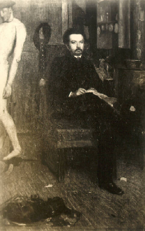 Giovane uomo con baffi, il pittore Barabino, seduto su una sedia tiene tra le mani un giornale; alle sue spalle un mobile a vetrina ed un manichino.